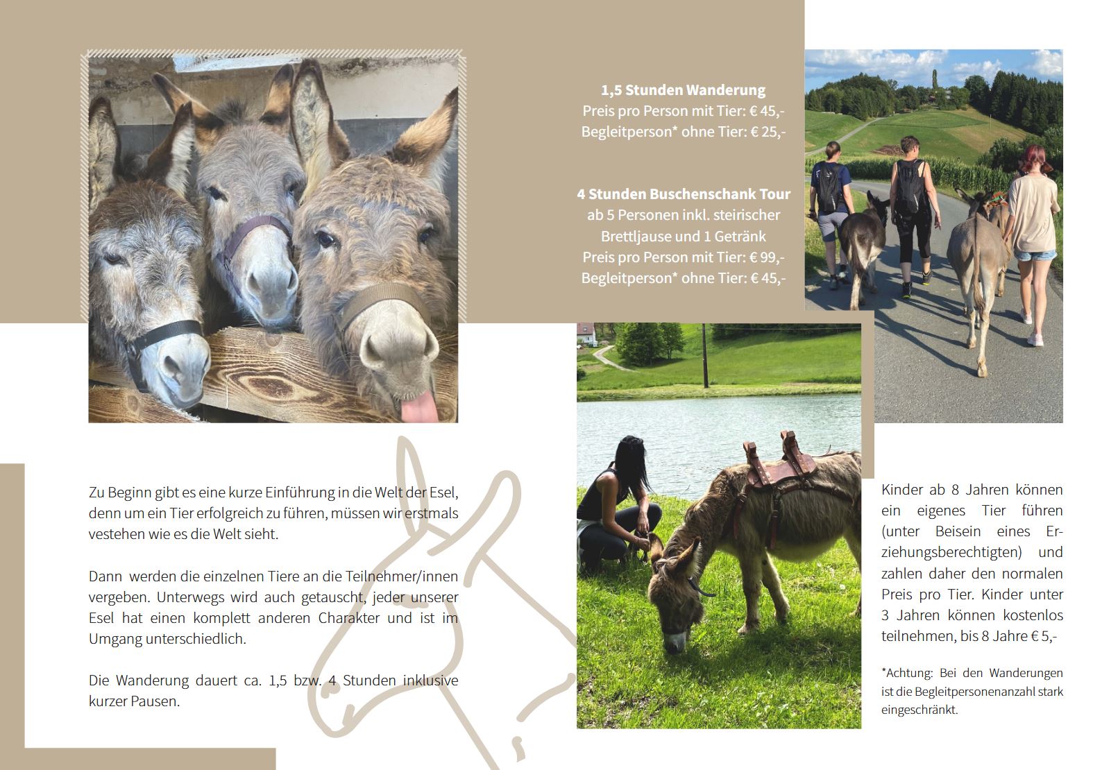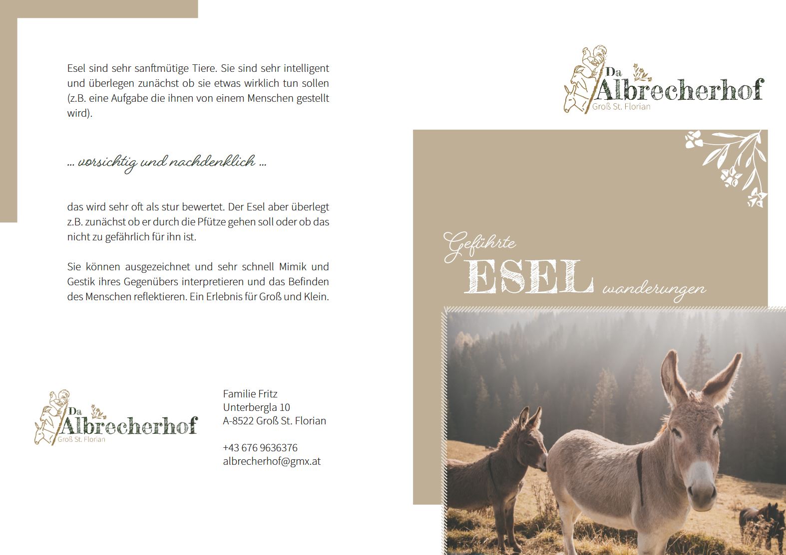 Hier auf unserem Hof in Groß Sankt Florian bieten wir unvergessliche Eselwanderungen durch das wunderschöne Schilcherland an. Neben den Wanderungen gibt es auch die Möglichkeit zu Hofführungen, hier könnt ihr verschiedene Tiere hautnah erleben. Außerdem stellen wir mit viel Liebe eigene Produkte wie Ziegenmilch her, die ihr in im Hofladen und auf Bauernmärkten erwerben könnt. Wir freuen uns darauf, euch auf dem Albrecherhof willkommen zu heißen!